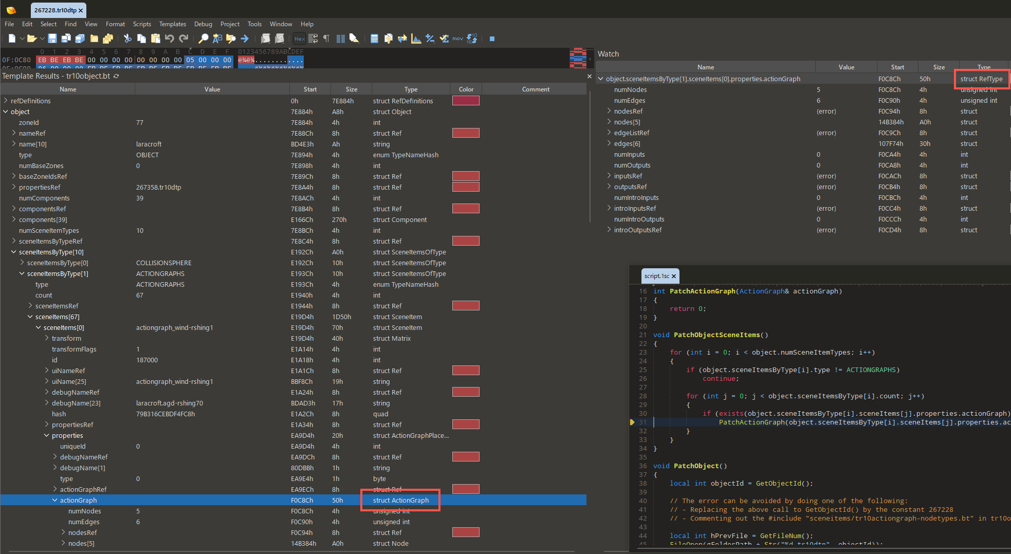 The screenshot below shows a script being debugged. As visible in the watch window, it thinks that the actionGraph field has the type struct RefType, but this is incorrect: the real type in the template is ActionGraph, and RefType is actually an enum, not a struct.